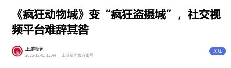 上游新闻2025-12-05《轻易动物城》变“轻易盗摄城”,酬酢视频平台难辞其咎